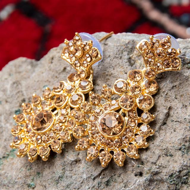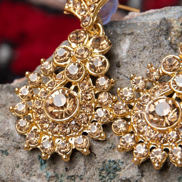 「インドのアクセサリーってゴージャスだけど、コーディネイトが難しくて…」とお悩みのあなたにオススメしたいのが、こちらのピアスとネックレスセットです。あらかじめ同系統のカラーやデザインで統一されているので、どういう風に組み合わせればいいのかと迷う必要は一切なし!いまこそ美を極め、ボリウッドスターのように輝いてみませんか?!こちらのアクセサリーがやってきたのは、ボリウッド映画やインドファッションの中心地、ムンバイ。照明との相性もよく光を受けて美しく輝きます。パーティーや結婚式の時など、華やかに彩りたい様々なシチュエーションで活躍してくれます。