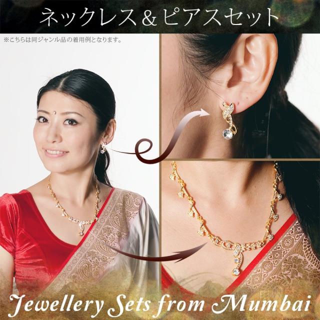 「インドのアクセサリーってゴージャスだけど、コーディネイトが難しくて…」とお悩みのあなたにオススメしたいのが、こちらのピアスとネックレスセットです。あらかじめ同系統のカラーやデザインで統一されているので、どういう風に組み合わせればいいのかと迷う必要は一切なし!いまこそ美を極め、ボリウッドスターのように輝いてみませんか?!こちらのアクセサリーがやってきたのは、ボリウッド映画やインドファッションの中心地、ムンバイ。照明との相性もよく光を受けて美しく輝きます。パーティーや結婚式の時など、華やかに彩りたい様々なシチュエーションで活躍してくれます。