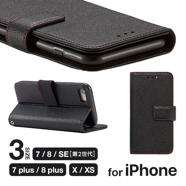 手帳タイプのiPhone用スマホケースです。iPhone7/8用・SE(第2世代)、iPhone7/8Plus用、iPhoneX/Xs用の3タイプをご用意しました。スマホを閉じたまま電話できて便利!シックなレザー調の風合いに、アクセントの利いた赤のステッチ。カードポケット×3、フリーポケット×1でカード等を収納可能!
