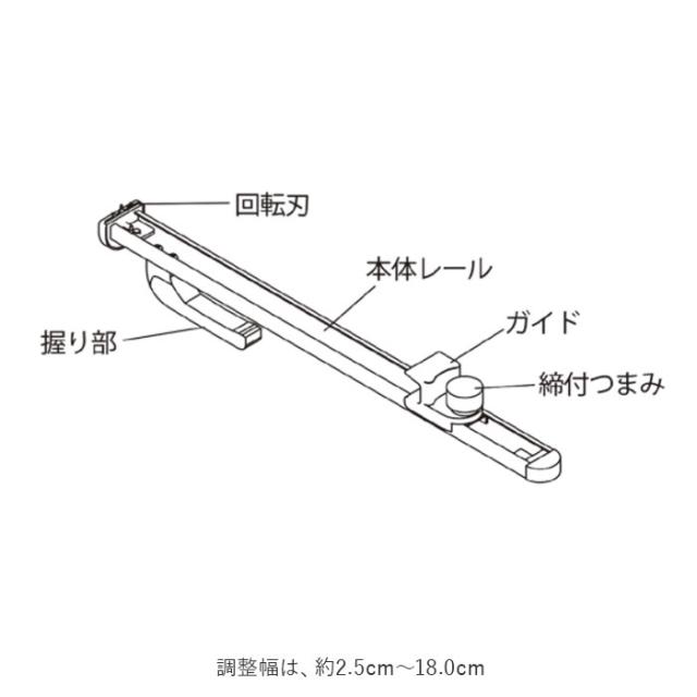 | 使用方法 | つまみを弛めた状態で、回転刃を段ボールの内側の折り目につけたい高さに合わせます。段ボールのふちにガイドを合わせてつまみを締めこみ固定します。段ボールのふちにガイドを沿わせながら、回転刃を横方向に動かしてミシン目をつけます。段ボールの四隅に、カッターナイフ等を使い、ミシン目を付けた高さまで切り込みを入れれば完成です。 |
