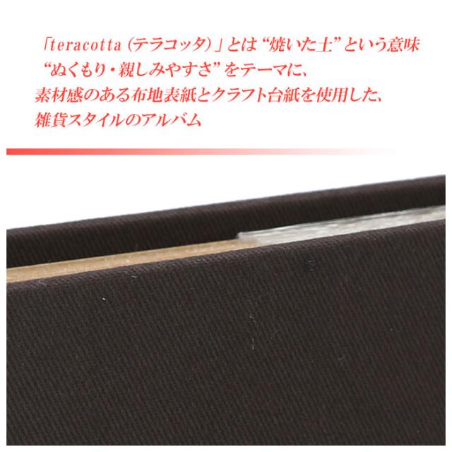 | 商品説明 | ・シンプルなデザインに欧風カラーがおしゃれ。L判の写真が240枚収納できる、teracotta(テラコッタ)無線綴ポケットアルバム 5冊セット ・「teracotta(テラコッタ)」とは“焼いた土”という意味。“ぬくもり・親しみやすさ”をテーマに、素材感のある布地表紙とクラフト台紙を使用した、雑貨スタイルのアルバム。 ・無線綴(とじ)で、本のような見ためなので、並べた時もとってもキレイ♪ ・1ページにL判が3枚入り、裏表で6枚入れられる仕様。台紙(クラフト)は40枚で、L判収納枚数は240枚。(※台紙の追加はできません。) ・クラフト紙の台紙なので、イラストやコメントも書き込める♪ |