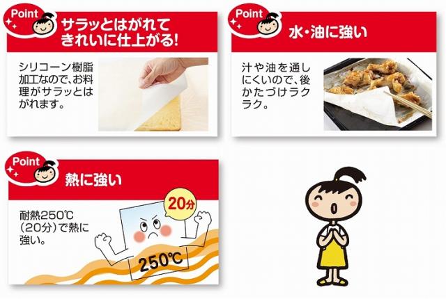 | 材質:シリコーン樹脂加工、パーチメント紙 寸法:幅30cm*長さ5m 耐熱温度:250度(20分) |