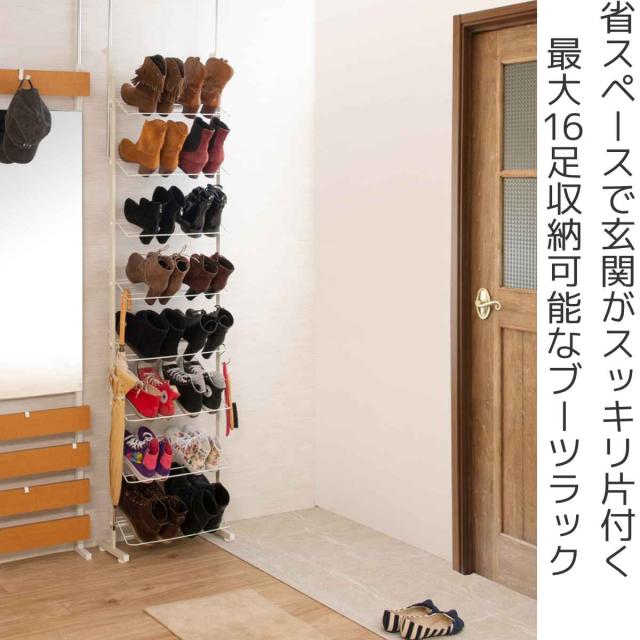 突っ張り ブーツラック 幅53cm 薄型 ホワイト 日本製 見せる収納 ( シューズラック ラック スリム 壁面収納 収納 つっぱり 靴収納 靴箱 最大16足 玄関収納 靴置き 壁面ラック 収納ラック 棚 奥行き 約 20 玄関 ブーツ 靴 シューズ )
