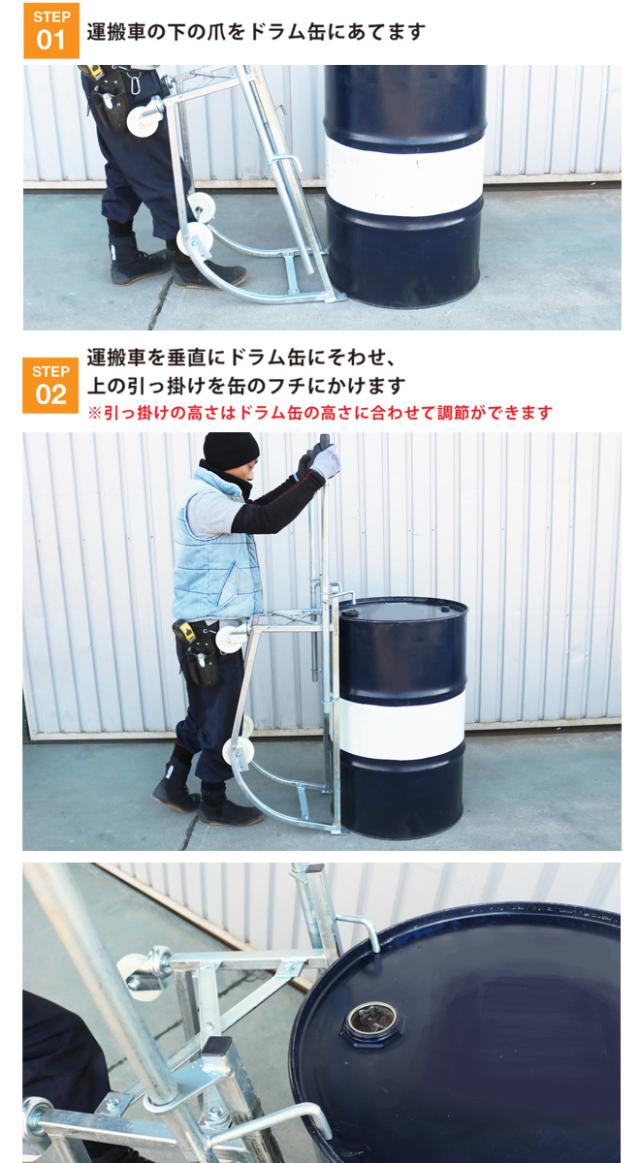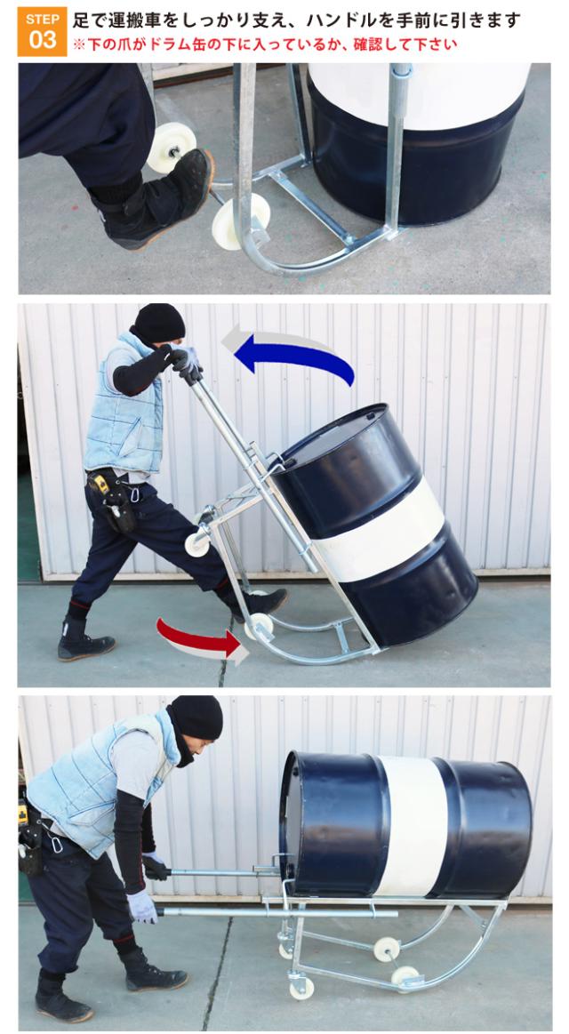 ドラム缶のちょっとした移動に ●ドラム缶移動とドラムスタンドの2役を1台でこなせるドラムキャリーです ●重いドラム缶を一人で自由に移動させて横倒しにする事ができます ●下の爪を缶につけ、上の引っ掛けを缶のフチにかけます 足をかけ手前に一気に引くと缶が持ち上がります ●上の引っ掛けの高さはドラム缶の高さに合わせて調節ができます ●横倒し時はキャスター4個で支えるので、横倒しのまま容易に移動ができます (ハンドルを持ち上げる必要がないので、ドラム缶を押して移動も可能です) ●ハンドル側のキャスター2個はブレーキ付きです ※画像は「ブレーキ無」タイプです ●ドラム缶にコックを取付ければ、横倒しの状態で中の材料を自然排出できます <別売り「ドラム缶コック(DC-2)」は こちら> ●ハンドルは短く収納できます ●商品はお客様での組立て品となります ※入荷時期によりデザインや仕様が一部変更になる場合があります ※ポリドラム缶は種類によって使用できない場合がございます ※力の強さは個人差がありますので、女性や力が弱い方はお使いいただけない場合がございます 品番:DHR-5 |