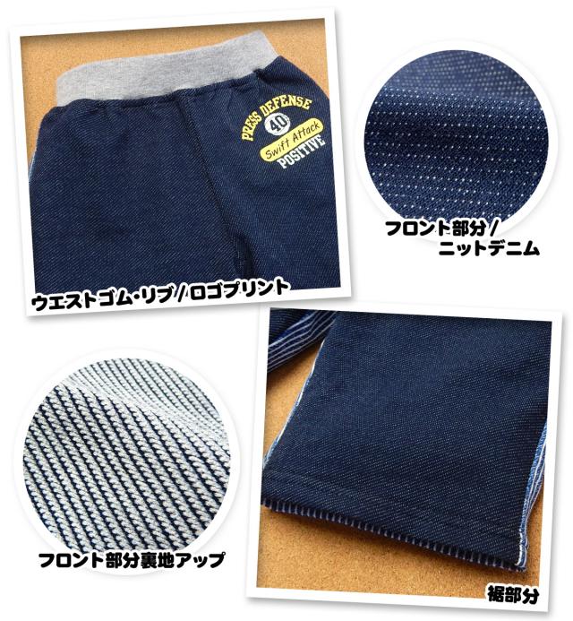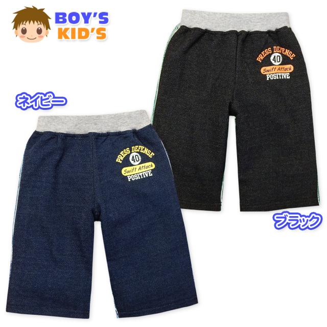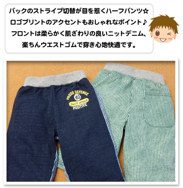 【送料無料】男児 キッズ ストライプ切替 ハーフ パンツ フロントニットデニム ロゴプリント ウエストゴム ボトムス 子供服 男の子 100cm 110cm 120cm 130cm a-2330【メール便対応】