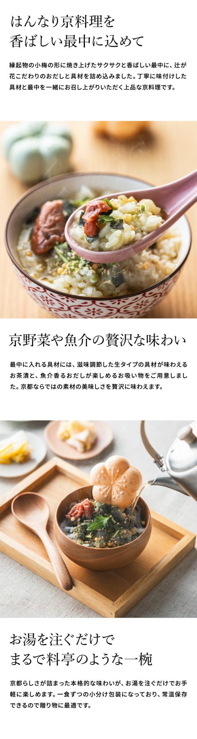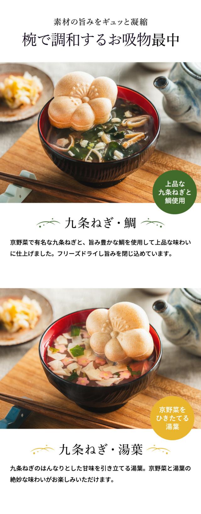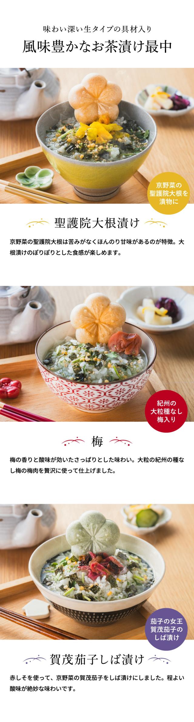 ●お茶漬(賀茂なすしば漬・聖護院大根漬×各2、梅・紅鮭×各1)、お吸物(九条ねぎ(湯葉・鯛)×各3)