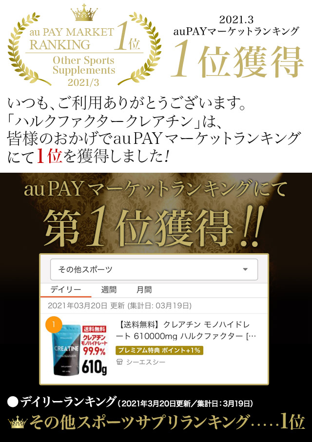 クレアチンモノハイドレート 1,000,000mg配合!(1回あたり5,000mg)。クレアチンパウダーは本気でトレーニングに挑むあなたに必要不可欠な成分です。現在、クレアチンには様々な品質グレードのものが市場に出回っており、ハルクファクターはクレアチンの中でも「 クレアチン モノハイドレート 」という品質が最も実感力をサポートできるとされているものを使用しています。さらに、純度99.5%の一般用原料も出回っておりますが、ハルクファクターは純度「99.9%」というプロフェッショナル品質のクレアチン モノハイドレート パウダーを使用いています。
