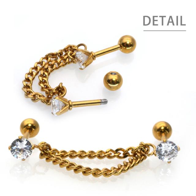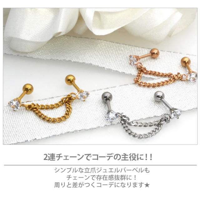 シンプルな立爪ジュエルバーベルもチェーンで存在感抜群に!周りと差がつくコーデになります。耳たぶピアス以外にも、軟骨ピアスや少し離れたホール同士をつなげるコーディネートもオススメです。バーベルの太さはボディピアスのスタンダードサイズの16G。材質はアレルギーが起きにくいサージカル(医療用)ステンレス素材なので安心です。