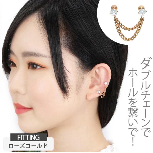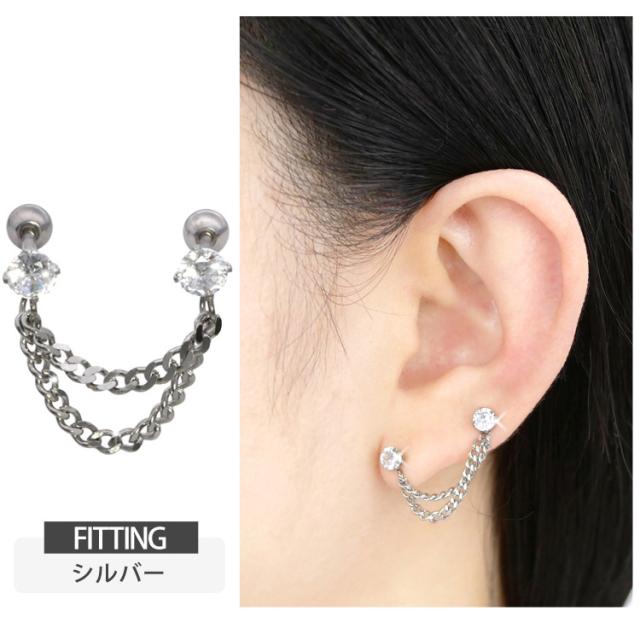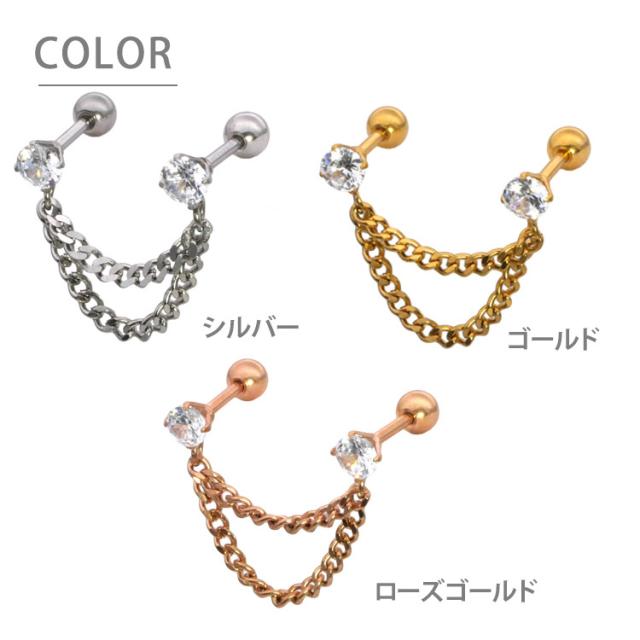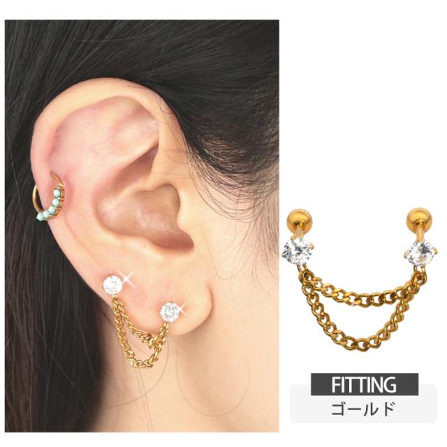 ピアス 軟骨 ボディピアス 2つのホールを繋げる ダブルチェーン立爪ジュエル2連バーベル 16G