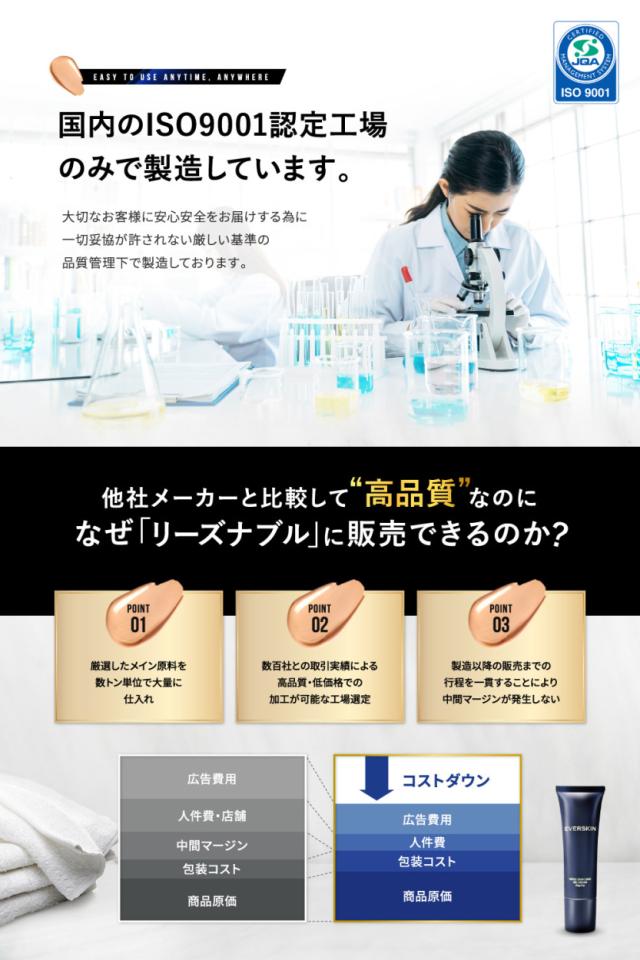 【安心・安全の日本製】直接地肌に使用するものだからこそ、EVERSKINメンズBBクリームは厳しい管理基準かつ国内生産にこだわりました。