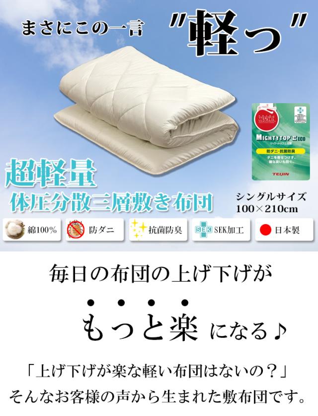 超軽量 体圧分散 三層敷き布団 【シングル:100×210cm】日本製 防ダニ 抗菌 防臭 マイティトップ