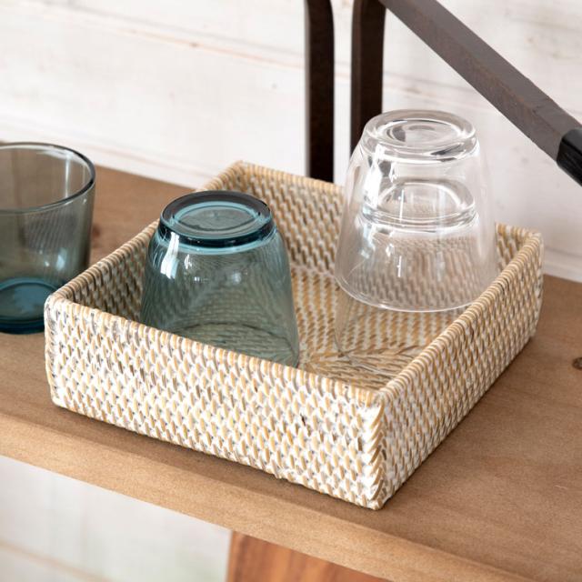 収納バスケット ラタン製 ホワイトウォッシュ 正方形 スクエア型 収納バスケット 小物収納 ラタンバスケット 小物入れ アジアン雑貨