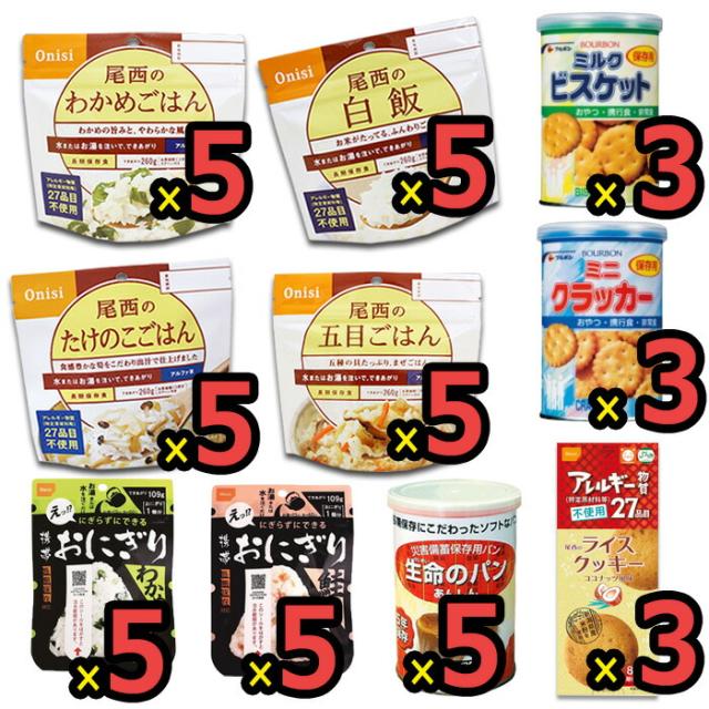 こちらは非常・保存食10種類44点セットのページです。 おひとり様、約7日分の非常食として。 ご家族分として。 賞味期限の近いものの、詰め替え用として。 キャンプ、アウトドアでの使用に。 お友達、ご近所様と分け合い。 企業様、自治体などの備蓄用に。 たくさん44点セットも入ったセットは、使い道色々。 製造より5年保存可能!アルファ米、ごはん、おにぎりは、 お湯で約15分、水で約60分でおいしいごはんが出来上がり。 すべて国産米を使用し、非常用持ち出し袋などにセットしたり、キャンプなどでもお使いいただける 美味しく手軽なごはんです! 缶入りパンもふんわりおいしく、避難先で心が安らぐビスケット、クラッカーなどのおやつも入っています。 ライスクッキーはパティシエ監修で、非常食とは思えないおいしさです! 非常用持ち出し袋の中に追加したり、ご家族用にご用意される時にぴったりの単品販売となります。 アウトドア、キャンプでもお使いいただけます! -セット内容- ●五目ごはん×5 ●わかめごはん×5 ●たけのこごはん×5 ●白飯×5 ●鮭おにぎり×5 ●わかめおにぎり×5 ●生命のパン×5 ●ミルクビスケット×3 ●クラッカー×3 ●ライスクッキー×3 合計10種類44点のセットです。 ■原産国:日本 -ご注意- ■災害発生後はご注文が非常に殺到いたします。納期にお時間をいただく場合がございます。セット内容は予告なく、同等の品に変更になる場合がございます。 また、発送・お問い合わせのご返答にはお時間を頂戴いたします。ご了承ください。 ■商品サイズ・カラーは、企画サイズとなります。 ■商品画像につきましては、モニターの種類・設定等により、実際の商品とは素材感や色味が異なる見え方をする場合があります。 ■細かなキズや、製造上避けられないシミ・シワなどがある場合があります。 ■商品仕様は、予告無く仕様変更される場合がございます。また、セット内容は予告なく同等の品に変更になる場合がございます。予めご了承下さい。 ■商品によっては、他店と在庫共有しているものがございますので、ご注文を頂戴した時点で、 在庫が確保できない商品につきましては、 ご注文をキャンセルさせていただく場合がございます。 なにとぞ、ご了承の程、よろしくお願いいたします。 |