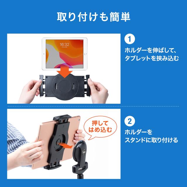 ●ホルダー部分が伸縮し、4.5〜10.5インチの各社タブレットに対応します。