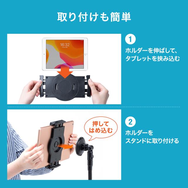 ●ホルダー部分が伸縮し、4.5〜10.5インチの各社タブレットに対応します。