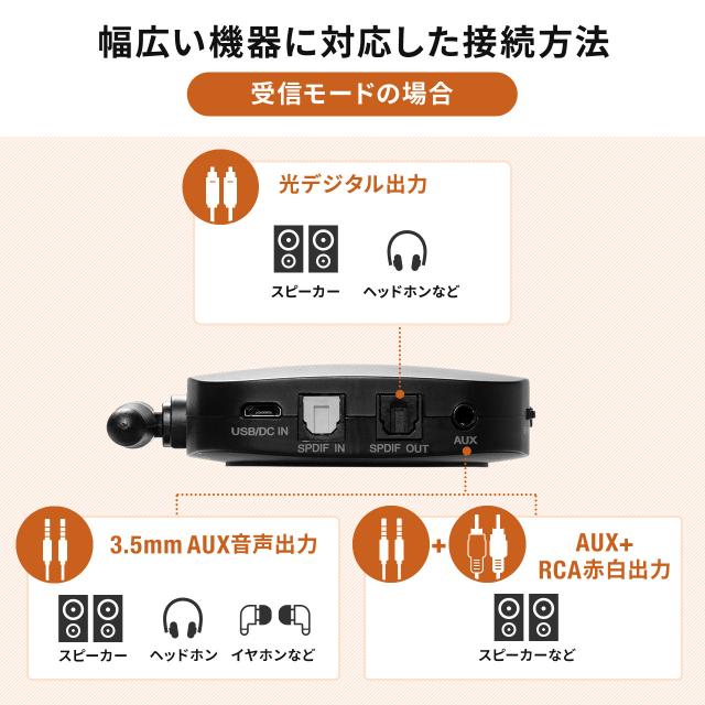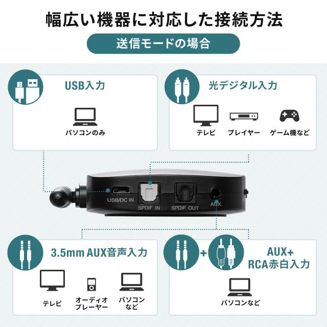 <送信機モード時>■入力・USB、光デジタル端子(角型)、3.5mmステレオミニプラグ接続が可能な機器