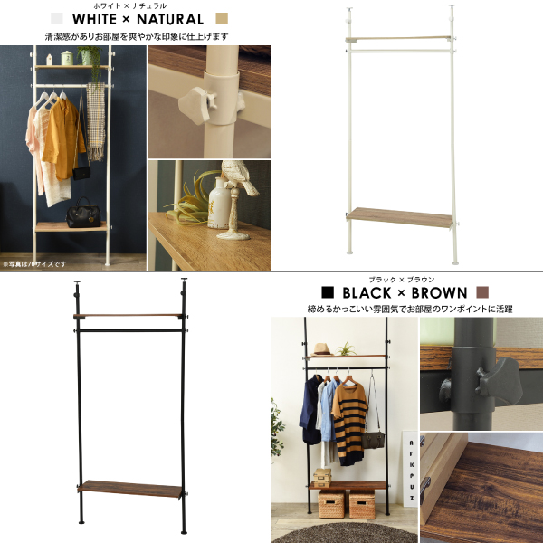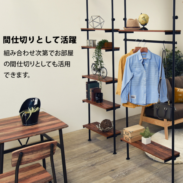 木目調の棚板とハンガーバーは無段階に高さ調節可能。スッキリ収納できるつっぱりハンガーラック。組み合わせ次第でお部屋の間仕切りとしても活躍できます!