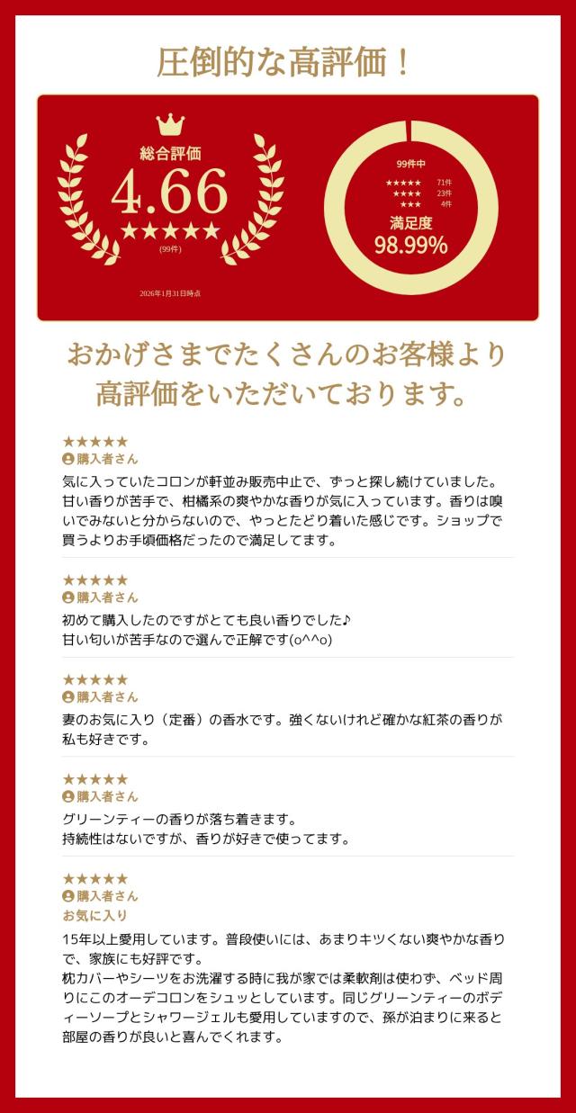 - リピートで買いました 好きな香りなので、探したら安く手に入ったので良かったです 迅速な対応ありがとうございました