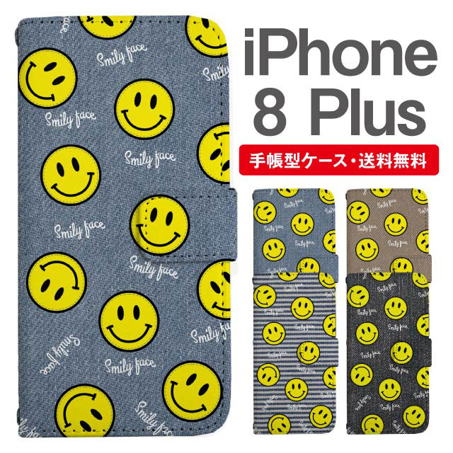 スマホケース 手帳型 iPhone8Plus アイフォン 携帯ケース カバー 送料無料 スマイリー ニコちゃん 絵文字 デニム柄 agesugi_ssm