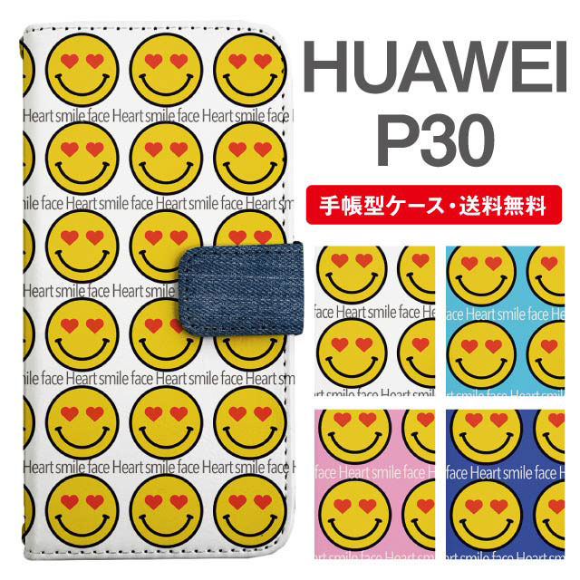 スマホケース 手帳型 HUAWEI P30 ファーウェイ 携帯ケース カバー 送料無料 絵文字 ハート スマイリー ニコちゃん agesugi_ssm