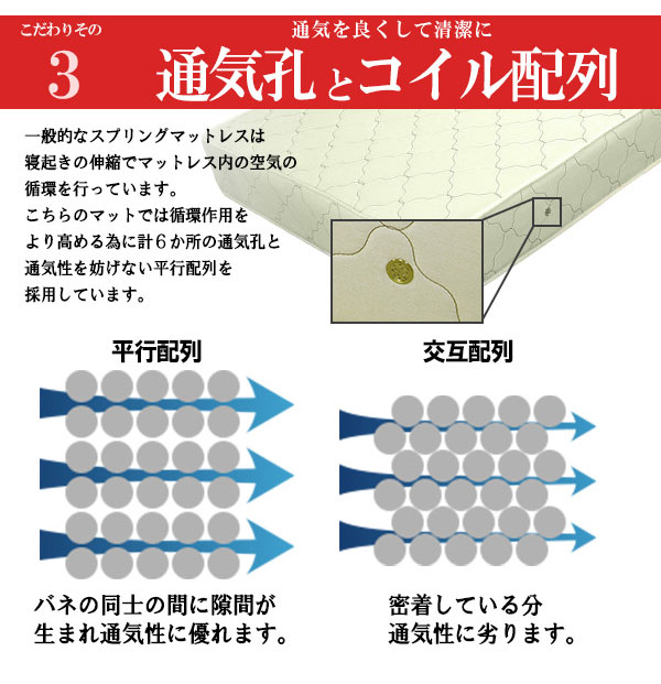 ■マットレス主材/2.1mmボンネルコイルスプリング(コイル数 SS:240個、S:270個、SD:330個、D:390個)、2.2mmポケットコイルスプリング(コイル数 SS:88個、S:92個、SD:98個、D:104個)、表地:ポリエステル 両面多針キルティング加工、中材:ウレタン/フェルト