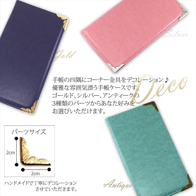 ・コーナーにゴールドのパーツをデコレーションしたエレガントな手帳型スマホケース。