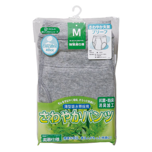 男性用失禁ブリーフ。40cc対応です。吸水帯が目立たず、スタイルは普通のパンツです。モレをすばやく吸収、サラッと快適に!!健康な毎日、着る人がもっと快適に!抗菌・防臭・消臭加工もばっちりです^^