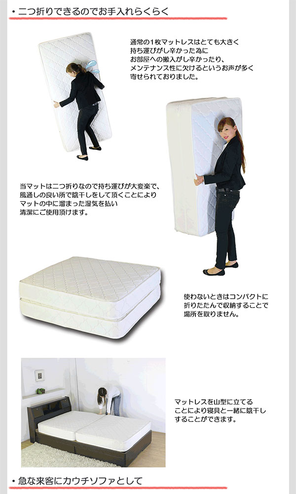 【日本製 棚付き 照明付き フロアベッド+二つ折り ポケットコイル マットレス ワイド 幅280cm】 連結 コンセント付き(代引不可)【送料無