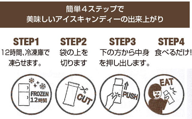 常温保存可、冷凍庫に入れるとアイスキャンディーの出来上がり! |