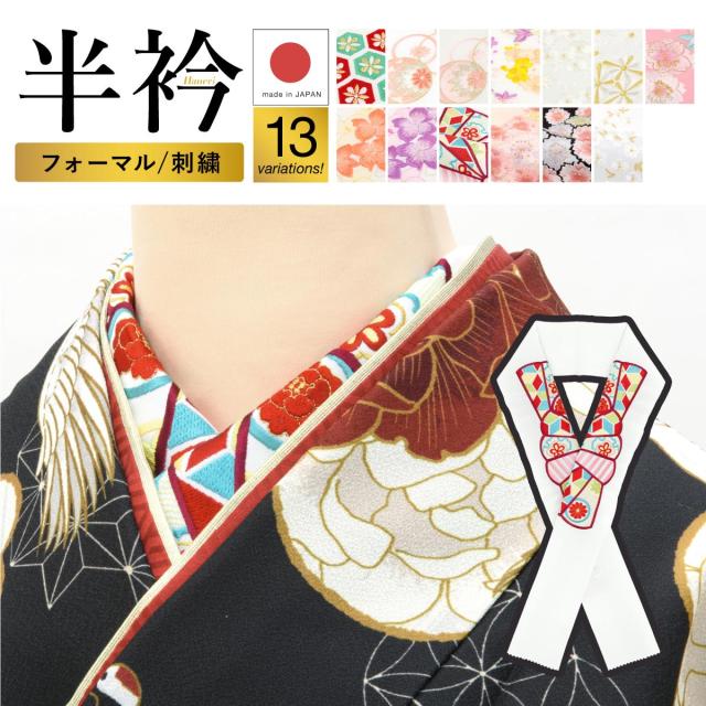 刺繍半衿 日本製 半衿 半襟 レディース 振袖 袴 訪問着 長襦袢 和装 刺繍 ホワイト ピンク ブラック 白 黒 桜 ハナミズキ 亀甲 手毬 扇子 花柄 和柄 レトロ 通年 メール便対応 送料無料