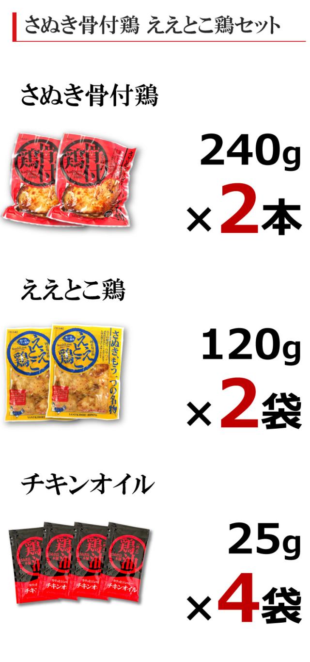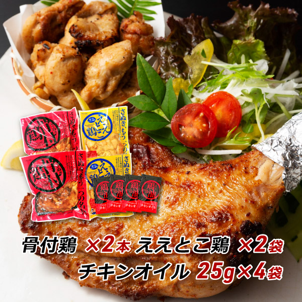 ■セット内容:骨付鶏 240g×2本、ええとこ鶏120g×2袋、チキンオイル 25g×4袋