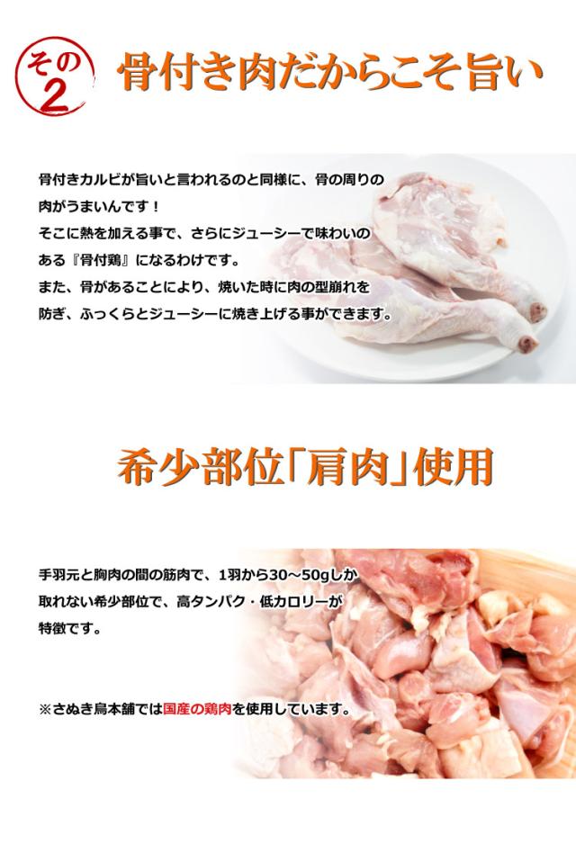 ■商品詳細:(さぬき骨付鶏)味付けした骨付鶏を、鶏の旨みがたっぷり詰まったチキンオイルで焼き、真空パックしたさぬき骨付鶏。