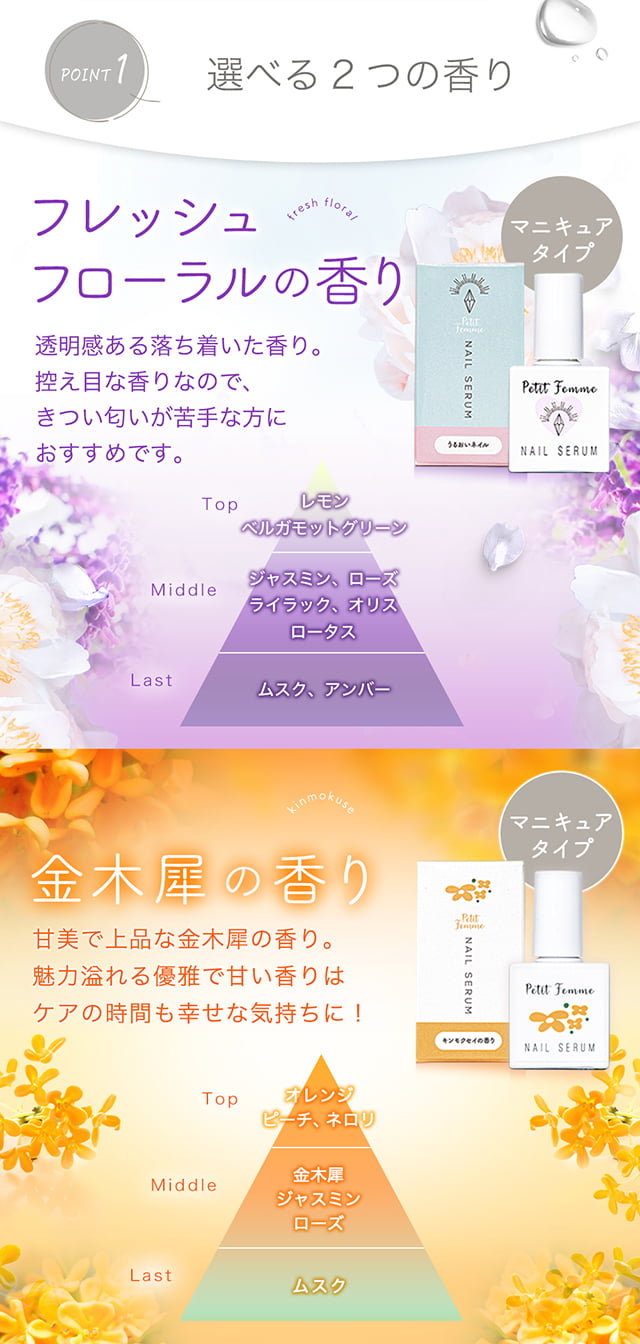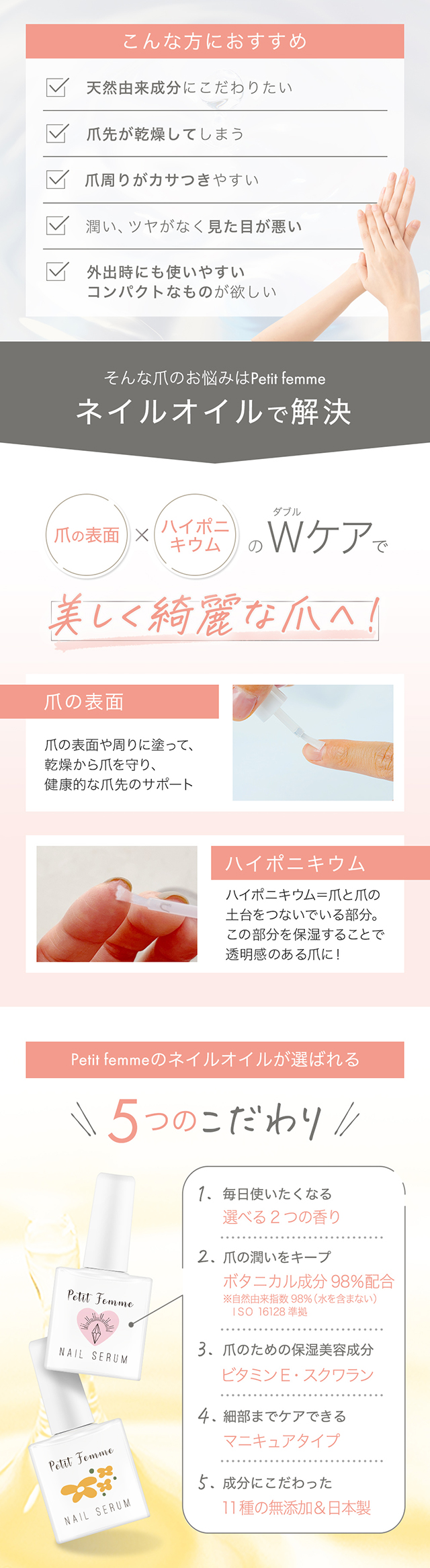 ネイルオイル 10ml Petit Femme 金木犀 ホワイトサボン ラベンダー 桜 ハイポニキウム ネイルセラム 爪 ケア 保湿 美容液 オイル 補修 保護 補強 シアバター 爪割れ ひび割れ ささくれ 割れ爪 二枚爪 甘皮 キューティクルオイル ネイルケア 栄養 プチファム