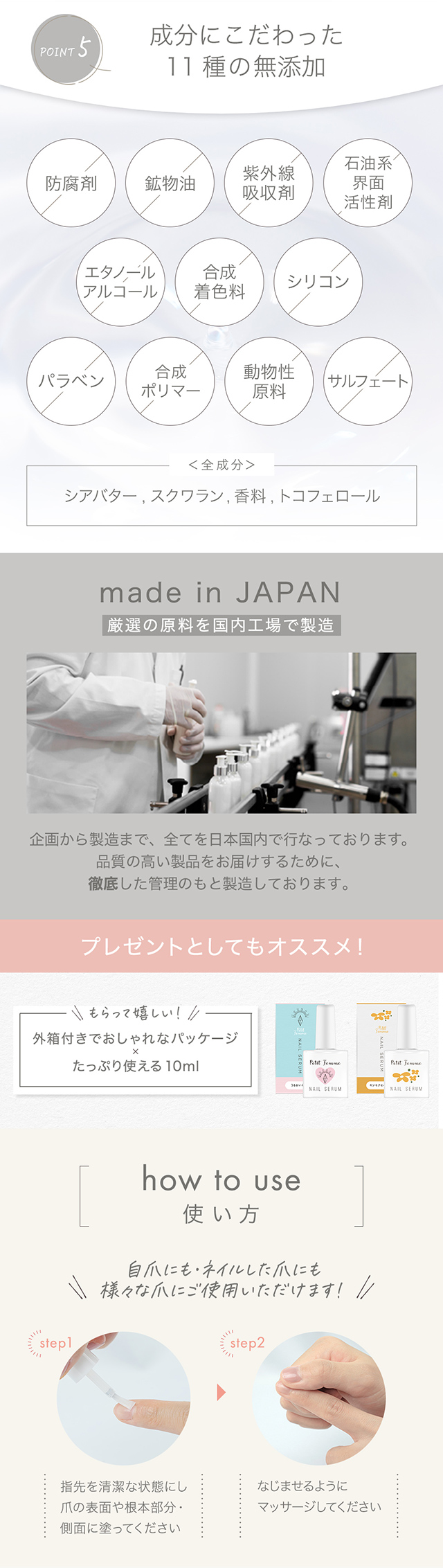 - 年々、爪が乾燥してきたので口コミの高評価のものを購入しました。塗り始めて半月ぐらいでシワと割れが小さくなってきたと思います。