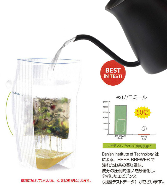 ティーバックのように粉砕された茶葉は、加工時に香りや風味のほとんどが失われやすく渋み成分である雑味も同時に出てしまいます。 ポットでジャンピング(茶葉が湯の中で踊るように開き、美味しさが抽出すること)によって自然に抽出されたお茶は、ポリフェノールや香り、うまみ成分がバランス良く溶け出して理想的に美味しく淹れることができます。 国際特許を取得しているHERB BREWERの特殊パッケージは、原料のハーブを粉砕せずにそのまま形で入れることを可能にし、従来のティーバックの数十倍の香りや風味・成分を抽出することに成功しました。 HERB BREWERは、例えばカモミールであれば50倍以上の香りや風味成分が抽出できることが照明されています。 未だかつてない美味しさとハーバルティー習慣をお楽しみいただけます。