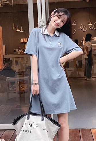 ミニワンピース シャツワンピース コットン 襟付き ショート丈 半袖 ゆったり Aライン 大人可愛い 春夏 キャラクター 刺繍 トレンド ブルー 10代 20代 30代 お出かけ デート カジュアル