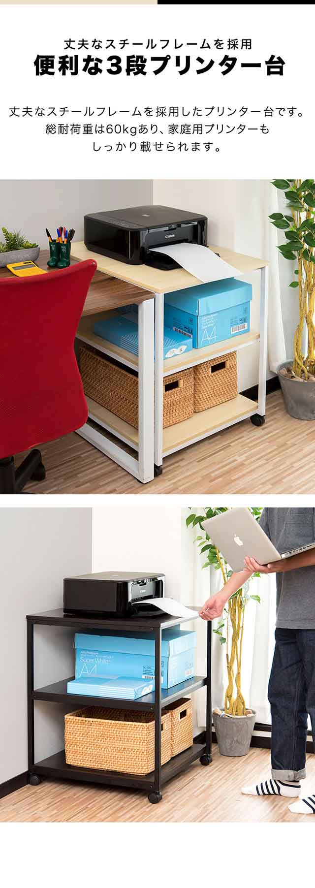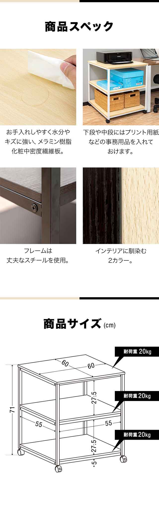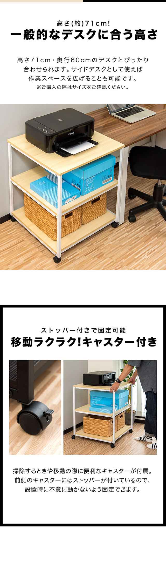 プリンター台 プリンターラック プリンターワゴン キャビネット チェスト スタンド キャスター付き ロック ストッパー付き 3段 2段 奥行60cm 幅60cm 高さ71cm 60×60cm 天板耐荷重20kg 総耐荷重60kg 天板が大きい 木製天板 スチールラック PC台 電話台 ファックス台 FAX プリンター台 レーザープリンター インクジェットプリンター 家庭用複合機プリンタ インテリア 収納 ラック サイドワゴン ワゴン デスクワゴン 拡張デスク オープンラック シェルフ オープンシェルフ 家具 住まい 多目的ラック マルチラック マルチワゴン フリーラック ディスプレイラック サイドラック 収納棚 収納ラック 隙間収納 組み立て式 省スペース 一人暮らし ワンルーム 新生活 見せる収納 新生活 オシャレ おしゃれ お洒落 おすすめ オススメ シンプル ナチュラル モダン 北欧 北欧家具 書斎 オフィス デスク 勉強机 デスク回り キッチン リビング ダイニング 寝室 インテリア・寝具・収納 オフィス家具 オフィス収納 ビーチ ダークウォールナット PCプラットフォーム・スタンド プリンタラック