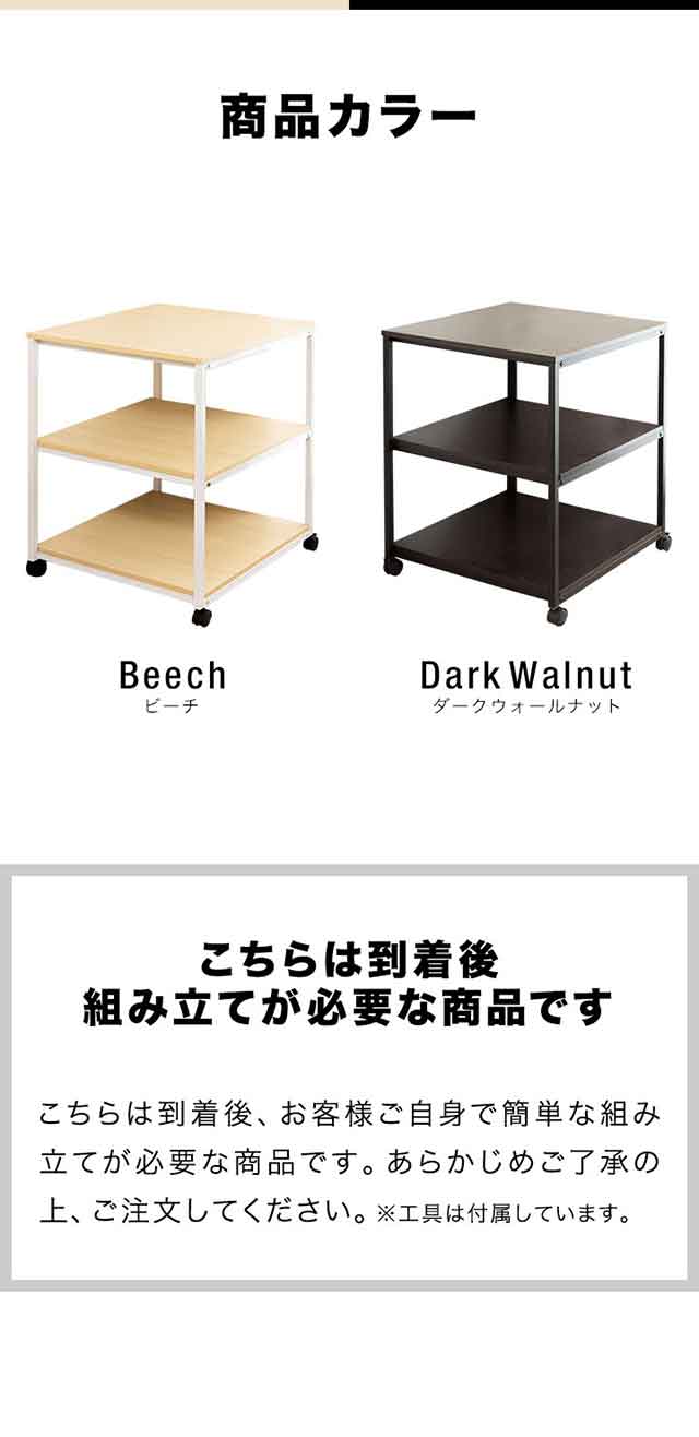 - 女1人で組み立てましたが、思ったより簡単でした。 これからプリンターや用紙など置いて使いたいと思います。キャスター付きなので移動が苦にならずとても良いです。