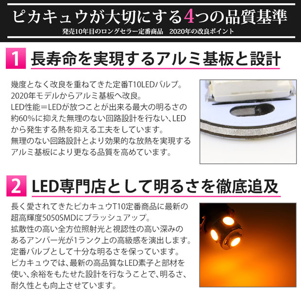 お客様に長く愛されてきたピカキュウの定番T10ウェッジバルブを最新の超高輝度5050SMDにブラッシュアップ。2020年モデルは従来の基板からアルミ基板へ変更し、より放熱効率を高めLEDバルブの長寿命を実現しています。ピカキュウがこだわり続ける製品の長寿命化。単に明るさだけを追求するのではなく、LED性能がもつ最大光量の約60%に明るさを抑えた無理のない回路設計を行い、LEDから発生する熱を抑える工夫をしています。