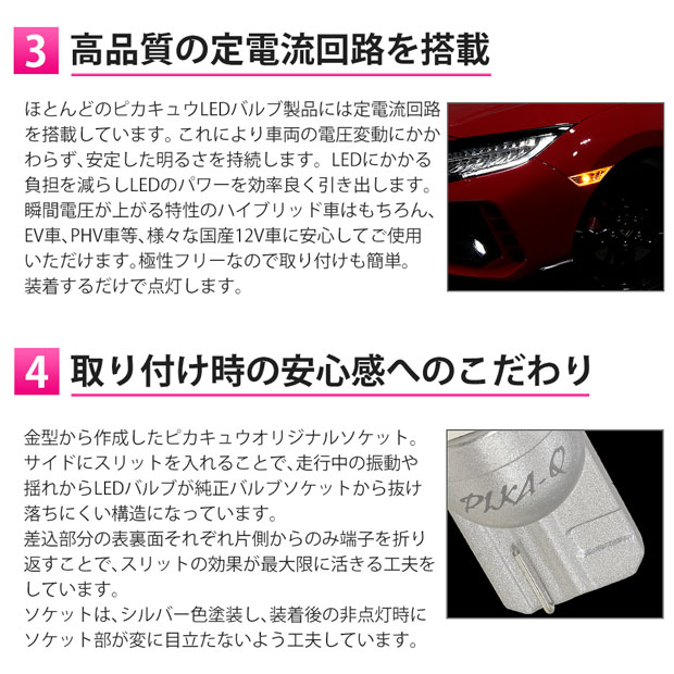 | お客様に長く愛されてきたピカキュウの定番T10ウェッジバルブを最新超高輝度5050SMDにブラッシュアップしました。使い勝手の良い定番LEDバルブながら、1球の明るさは90ルーメンを実現しています。 ピカキュウがこだわり続ける製品の長寿命化。単に明るさだけを追求するのではなく、LED性能がもつ最大光量の約60%に明るさを抑えた無理のない回路設計を行い、LEDから発生する熱を抑える工夫をしています。 更に、アルミ基板へ変更し、より放熱効率を高めLEDバルブの長寿命を実現しています。 | ||||