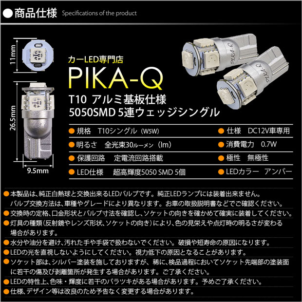 | 人気の定番バルブ | 鮮やかでキレのあるアンバー光が全方向に照射するのでランプユニットのリフレクターに効率よく反射します。バルブサイズがほぼ純正白熱球と同等サイズなのでバルブ規格がT10であればサイドウインカーランプ、サイドマーカーランプなどに装着出来ます。LED専門店として明るさを徹底追及し、T10定番バルブとして十分な明るさを保っています。 | |||
