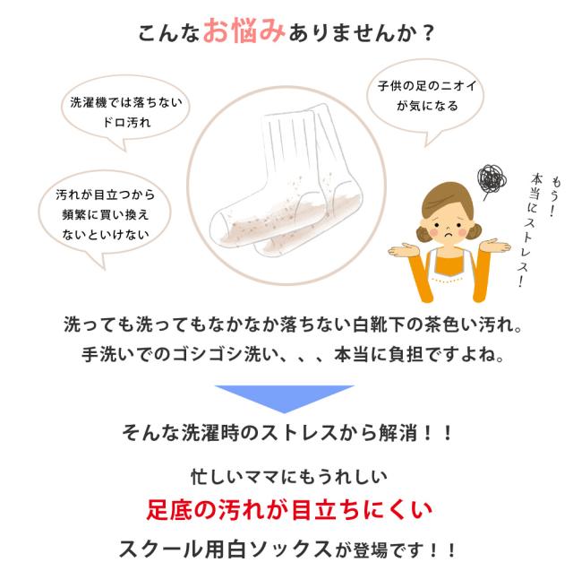 ●洗っても洗ってもなかなか落ちない白靴下の茶色い汚れ。手洗いでのゴシゴシ洗い、、、本当に負担ですよね。そんな洗濯時のストレスから解消!忙しいママにも嬉しい足底の汚れが目立ちにくいスクールソックスが新登場です! ●つま先・かかと補強で丈夫で長持ち!プラス消臭加工で足のニオイも気にならない! ●かかと〜履き口まではサポート構造で適度な着圧具合。ふくらはぎにしっかりフィットし運動やスポーツにも◎気になるズレ落ちも防いでくれるからきちんと感が好印象です。 ●靴を履いたら普通の白ソックスなので見た目も◎ |
