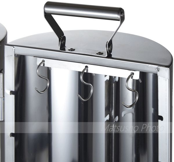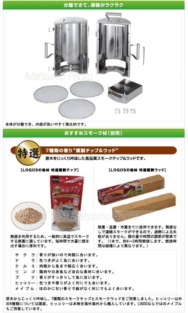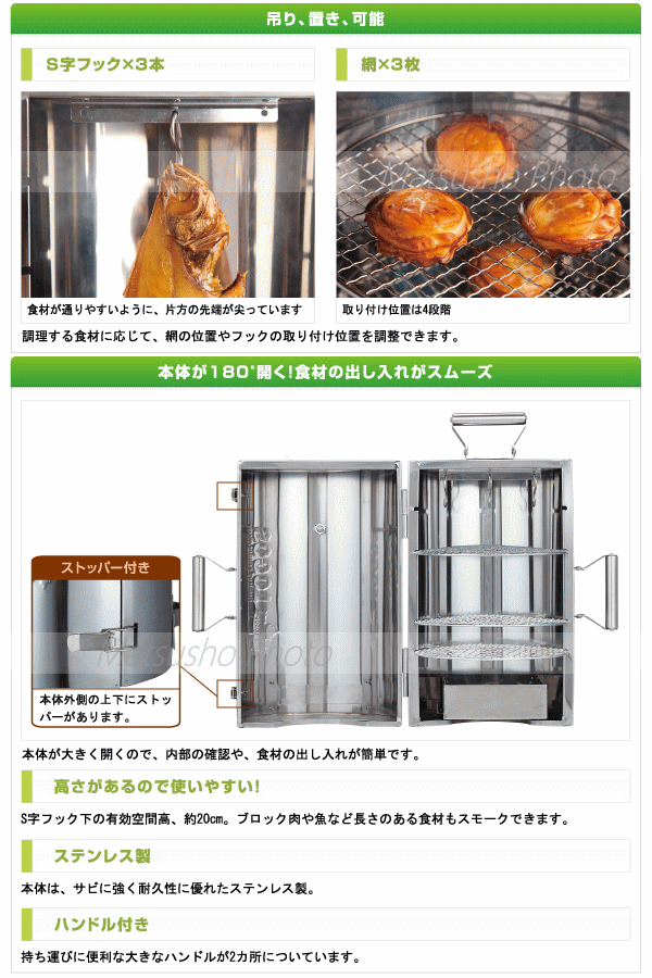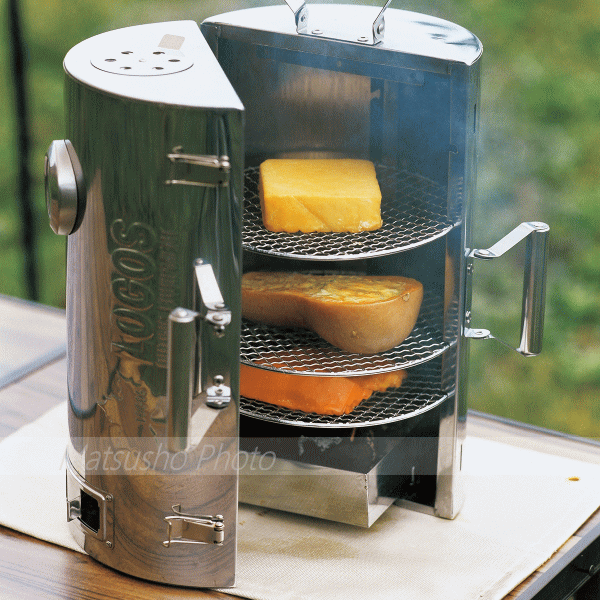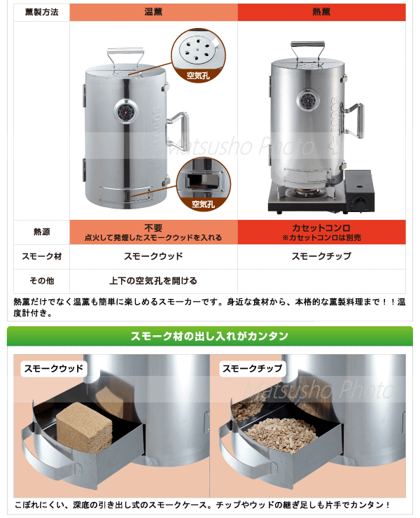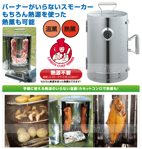 簡単!バーナーがいらないスモーカー!もちろんバーナーを使った熱薫も楽しめます。手軽に使える熱源のいらない温薫!カセットコンロで熱薫も。熱薫だけでなく温薫も簡単に楽しめるスモーカーです。身近な食材から本格的な燻製料理まで!温度計付き。こぼれにくい深底の引き出し式のスモークケース。チップやウッドの継ぎ足しも片手でカンタン!調理する食材に応じて網の位置やフックの取り付け位置を調整できます。本体が大きく180°開くので内部の確認や食材の出し入れが簡単です。S字フック下の有効空間高約20cm。ブロック肉や魚等長さのある食材もスモークできます。本体は錆に強く耐久性に優れたステンレス製。持ち運びに便利な大きなハンドルが2ヵ所についています。本体が分離できるので掃除がラクラク!内部が洗いやすく衛生的です。■総重量約3.1kg■サイズ[組立時]約幅26×奥行25×高さ42cm[網]直径23cm×3pcs[S字フック下の有効高]約20cm■主素材:ステンレス、スチール