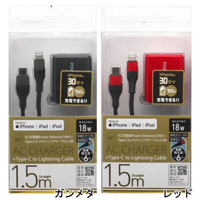 Power Delivery充電に対応したAC充電器、充電と通信に対応したLightningケーブルのセット商品です。本製品はPower Delivery (PD)に対応した機種(iPhone8以降)を高速に充電する事が出来ます。PDに対応していない機種(iPhone8以前のモデル)の場合は、従来の充電方式(電圧5V)で充電します。付属ケーブルはPD対応のType-C⇔Lightningケーブルです。ケーブルは断線しにくい高耐久メッシュケーブルを採用しています。特に断線しやすいコネクタの根本を曲げから保護する形状を採用する事により強い屈折耐久性があります。カラーバリエーションは、ガンメタ(JAN:4582439621002/品番:IH-ACC18L150GM)、レッド(JAN:4582439621019/品番:IH-ACC18L150RD)です。