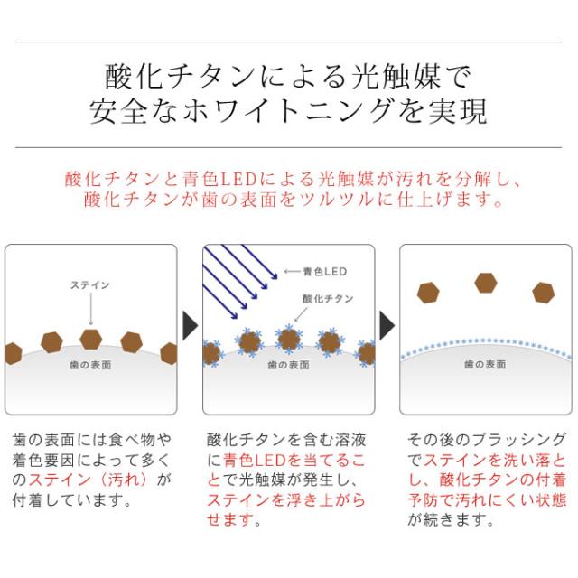 光触媒とは、酸化チタン(無害な真っ白な物質)にLEDを照射することで歯を白くする化学反応を促進させること。
