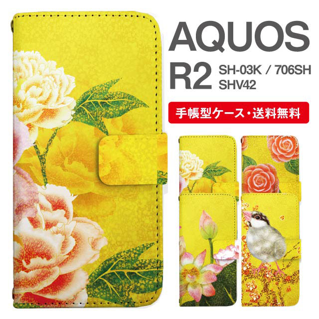 スマホケース 手帳型 AQUOS R2 アクオス SH-03K SHV42 706SH 携帯ケース カバー 送料無料 和柄 日本画 牡丹 椿 蓮 文鳥 agesugi_ssm