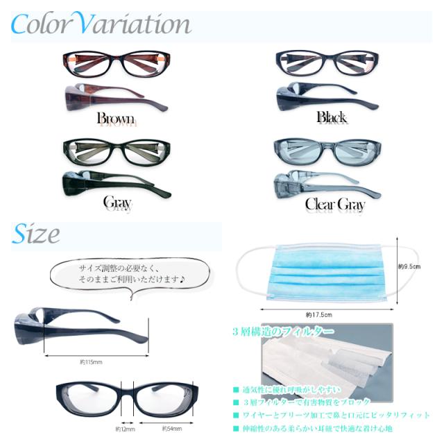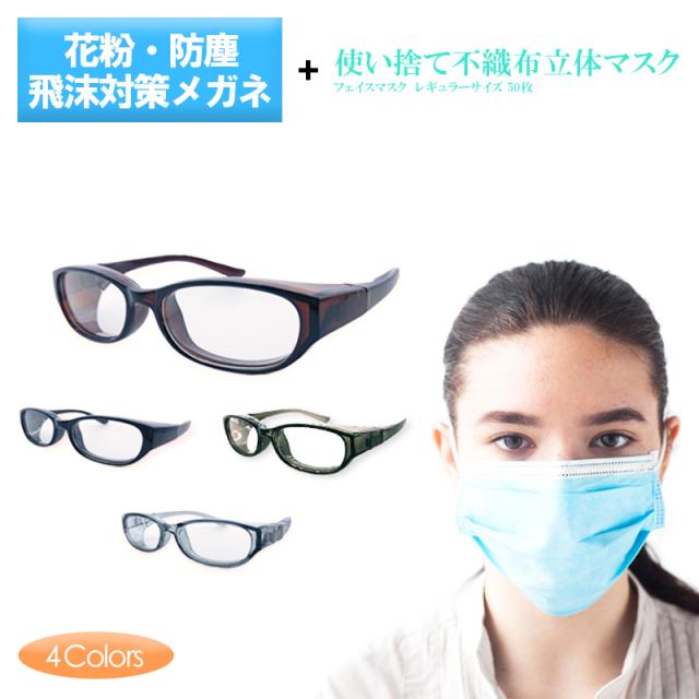 飛沫防止メガネ 大人用 + マスク 50枚 セット 3層構造 不織布 使い捨て 花粉 防塵対策 眼鏡 オーバルタイプ 紫外線カット UVカット 防曇加工 くもり止め