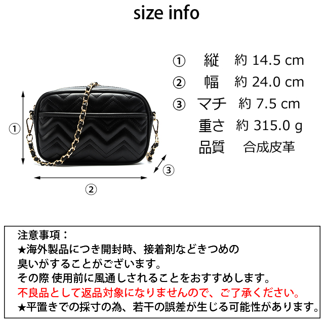 人気インスタグラマーに多数紹介されましたリッチなゴールドのチェーンにキルティングが今年っぽいコンパクトなのに存在感のあるレザー調ショルダーバッグいつものコーデに取り入れるだけで一気におしゃれ度の増すアイテム!!モデル身長:170cm商品説明:■サイズ:縦:約14.5cm 幅:約24cm マチ7.5cm ■重さ:315g■素材:本体:合成皮革■原産国:中国■【注意】アウトレット商品ご購入の際、下記の状況をご理解して頂いた上、ご購入お願いします。本商品は生産、輸送途中に多少の問題の発生した訳あり商品となります。商品によってキズ、シミ、シワ、汚れ、ステッチ取れ、生地離れなどがございます。細かい部分など気になる方のご購入はご遠慮ください。そのため、ご購入後の交換、返品は不可とさせていただきます!ご注意ください。■注意事項:【下記のように、不良品として返品・交換対象になりませんので、ご了承ください。】★海外製品につき開封時、接着剤などきつめの臭いがすることがございます。その際、使用前に風通しされることをおすすめします。★生産時期により裏地の変更もあります。