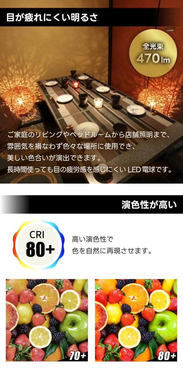 4Wの省エネLEDで、明るさは従来の40W形白熱電球相当(全光束470lm)。長時間使っても目の疲労感を感じにくく、あたたかみがある電球色でありながらも色をバランスよく再現できる高演色(Ra>80)です。