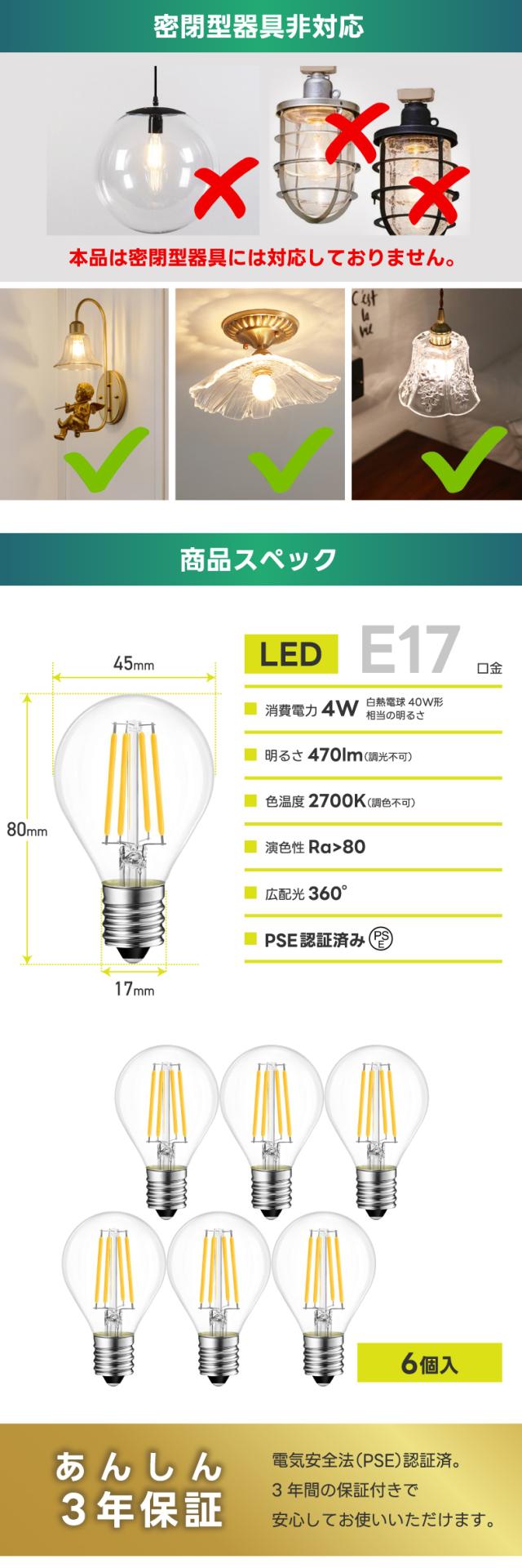 | 商品名 | LED電球 フィラメント E17口金 40W形相当 クリア電球4W 電球色 ミニ電球 小型 470lm PSE 6個入 調光器非対応 |